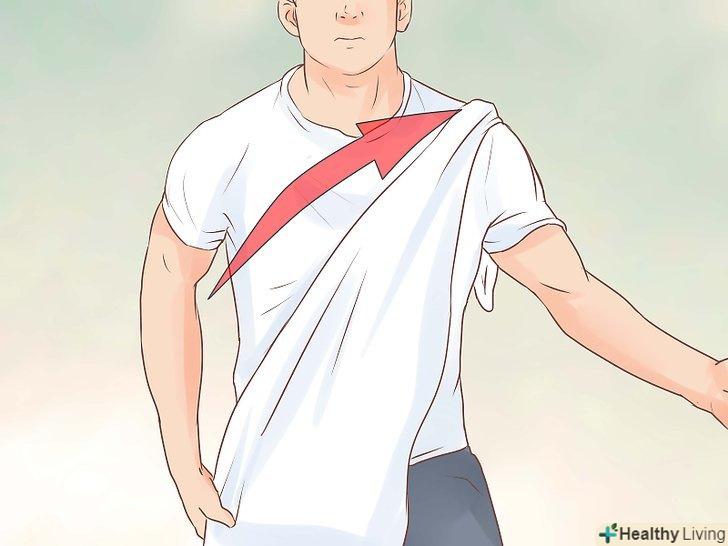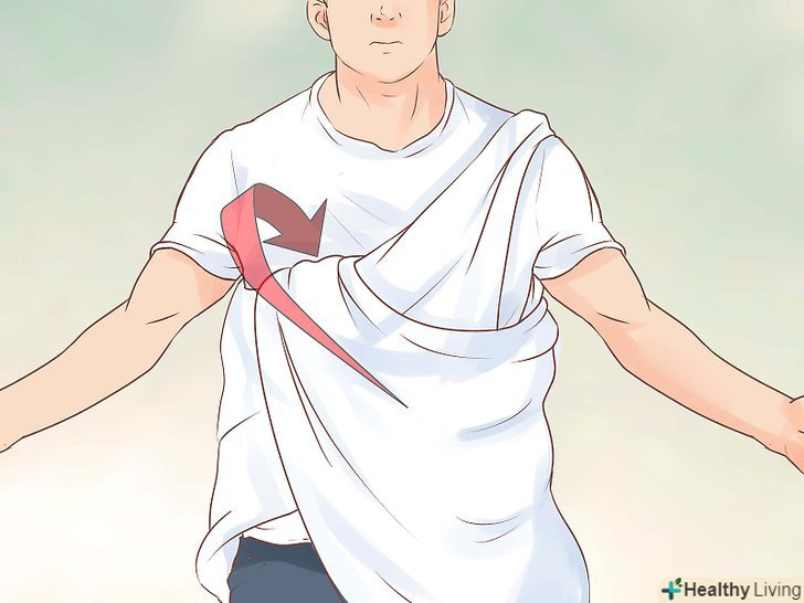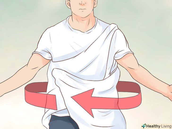 Оберніться тканиною.Візьміть довгий кінець тканини і оберніть його по діагоналі через груди, заведіть під праве плече. Після Оберніться тканиною зі спини, заводячи під ліве плече до грудей.