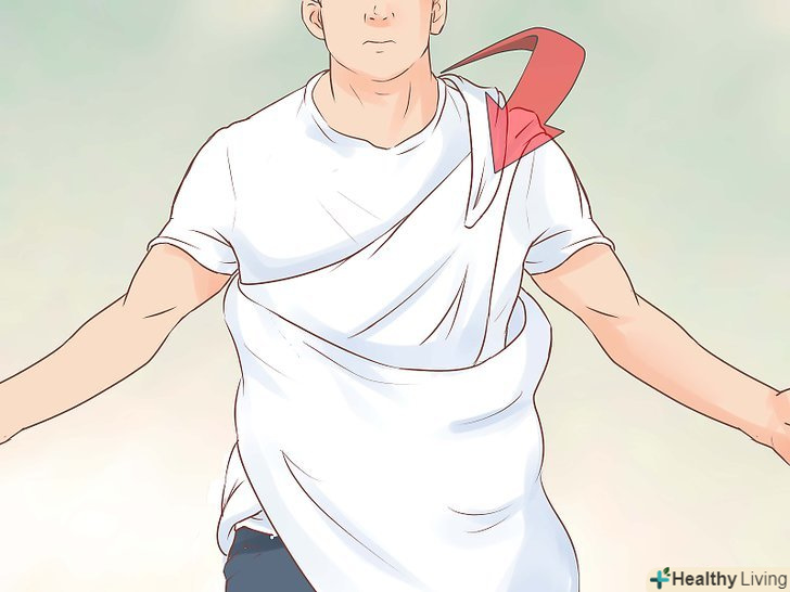 Перекиньте тканину через плече.коли довгий кінець знову виявиться спереду, проведіть його по грудях і через інше плече. Кінець закріпіть на плечі, він повинен вільно спадати.