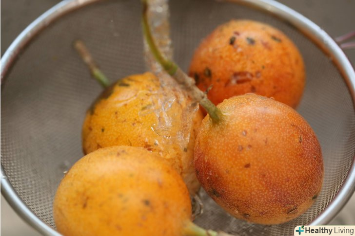 Помийте маракуйю.як тільки купили маракуйю, обов'язково помийте її. Хоча ви і не будете їсти шкірку, важливо помити фрукти, щоб хімікати, бактерії або жуки не потрапили до вас в рот. Це трапляється, коли немитий плід ріжеться ножем, і ніж переносить бактерії з шкірки на м'якоть.