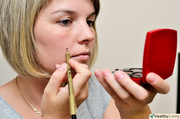Подружитеся з макіяжем.для максимального ефекту зафарбуйте родимки, родимі плями, зморшки або інші недосконалості вашого обличчя. Освітліть або затемніть колір шкіри, щоб заплутати людей ще більше. Нанесіть автозагар або тимчасове татуювання.- Якщо ви хлопець і зазвичай не фарбуєтеся, трохи косметики допоможе вам змінити зовнішність. Додайте трохи підводки для очей і змініть одяг, щоб створити абсолютно новий образ.