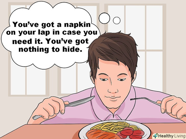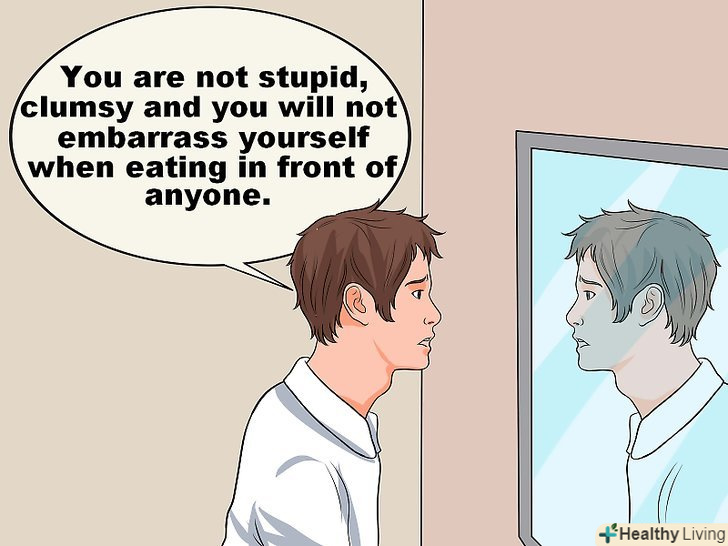 Використовуйте позитивний внутрішній діалог, щоб підготуватися до соціальних ситуацій. [12] Станьте своїм головним уболівальником, забезпечуючи підтримку в будь-якій ситуації. Скажіть собі: "ти насолоджуєшся їжею і знаєш, що вона смачна і дуже корисна. Поруч завжди є серветка. Переживати нема про що".