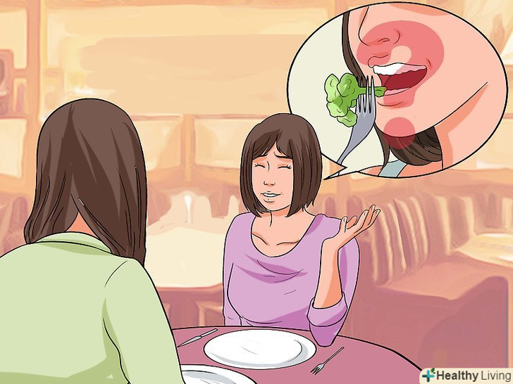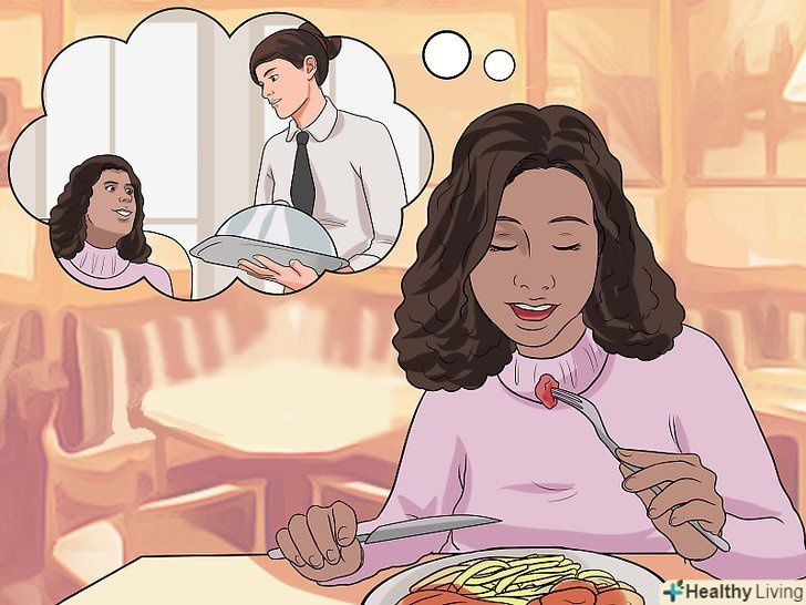 Розслабтеся до, під час і після їжі. спокій-ключ до контролю над ситуацією. Ваше завдання-створити власне почуття спокою, щоб не хвилюватися, а насолоджуватися їжею. Використовуйте різні методи, які допомагають розслабитися. [4]- Перед прийомом їжі закрийте очі і уявіть, як ви насолоджуєтеся їжею, при цьому ведете прекрасну бесіду. Уявіть, як офіціант пропонує вам покуштувати неймовірні страви. Зверніть увагу, що люди навколо зосереджені на своїй їжі, а не на вас.
