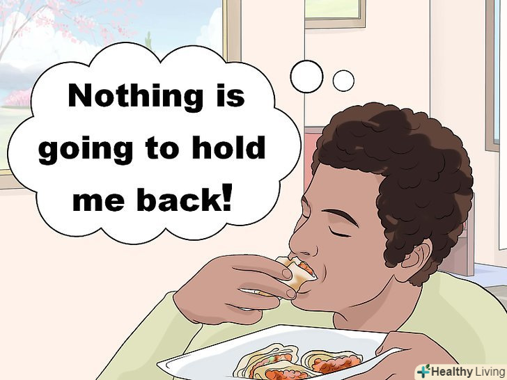 Відкиньте комплекси і їжте. комплекси-це обмеження, самостійне накладені на себе і свою поведінку, які породжують самообмеження і збентеження. Люди з позитивним мисленням зазвичай мають менше комплексів, що дозволяє їм легко змінюватися. [15]- Сприймайте кожну страву з позитивного боку і скажіть собі «це буде дуже смачно і ніхто не завадить мені насолодитися їжею. Мене ніщо не стримує"»