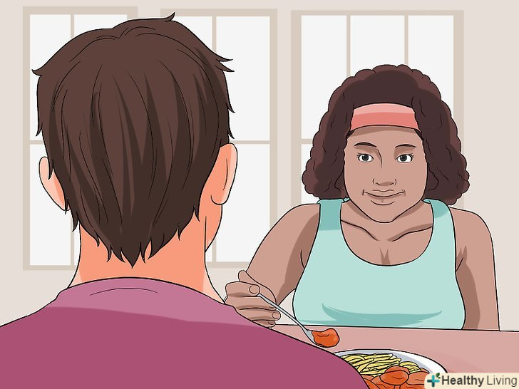 Проясніть для себе процес прийому їжі. їжа-це енергія, а енергія потрібна людям для виживання. Якщо прибрати соціальні підгрунтя прийому їжі і розглядати процес як життєво необхідну функцію, то ви послабите тиск на себе. Всякий раз, сідаючи за стіл, перемикайте думки і сприймайте це як можливість підзарядитися. Енергія потрібна вам для того, щоб виконати задумане.- Зосередьтеся на тому, що ви робите корисні для здоров'я дії, щоб думки про те, як ви виглядаєте під час їжі, відійшли на другий план.