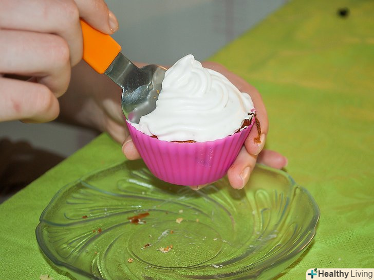 Однією рукою візьміть кекс трохи нижче глазурі, а інший обережно зніміть нижню частину підстави. акуратно візьміть його і переконайтеся що він все ще цілий.