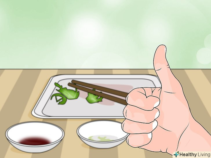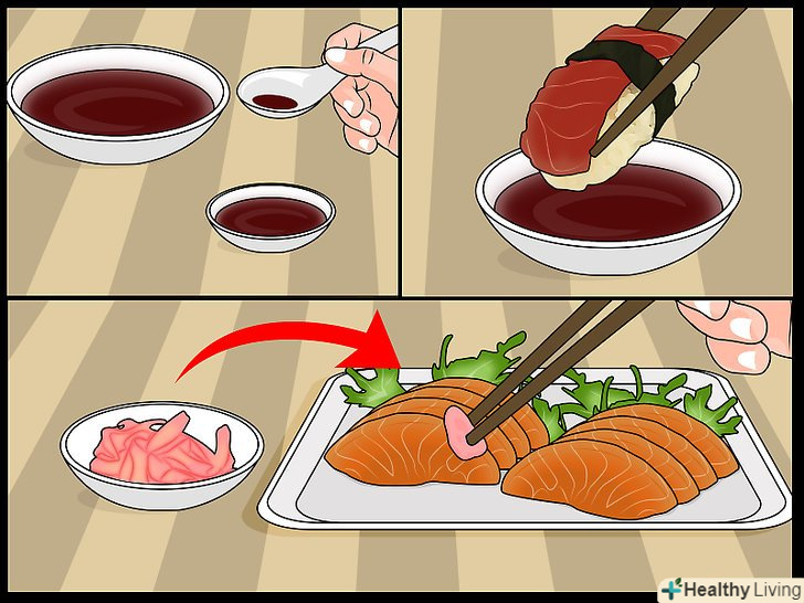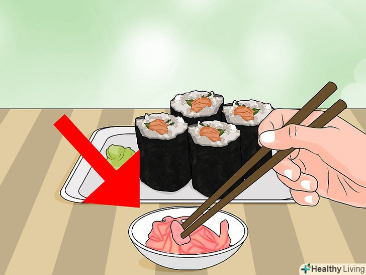 - Крім того, можете за допомогою паличок вмочати імбир в соєвий соус, а потім використовувати його, щоб промокнути рибу соусом, а не вмочати в соус безпосередньо саму рибу. Це додасть лише "аромат" імбиру, а сам імбир є не обов'язково.