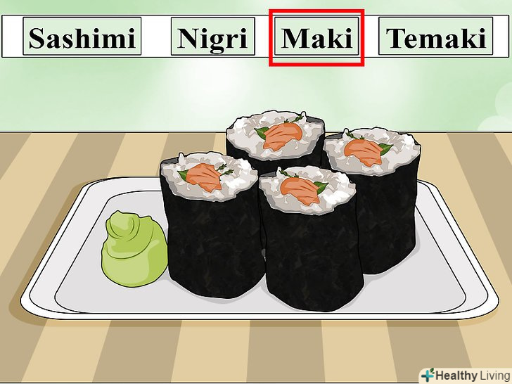 Вивчіть основні види суші. майже в кожному суші-барі у вас повинен бути вибір з сашимі, нігірі, Макі і темакі.- Маки також називають "суші рол". Зазвичай маки включають один або два види риби і овочі, загорнуті з рисом в лист обсмажених морських водоростей і нарізані на маленькі овали. Це, як правило, найкращий початок для тих, хто трохи гидує їсти сиру рибу.