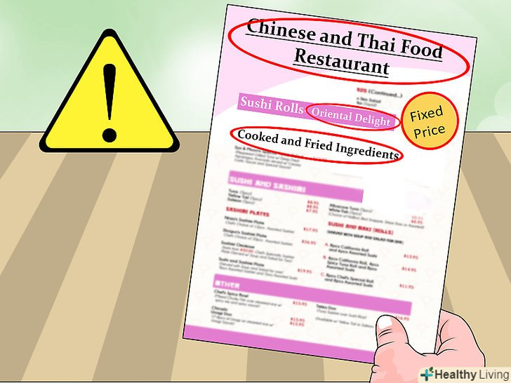 Перевірте меню на попереджувальні знаки, що якість може бути не найкращим.іноді буває важко відрізнити хороший ресторан, в якому подають якісні інгредієнти, від поганого. Запитати " ви подаєте свіжу рибу?"може бути трохи грубим, так що вчіться розпізнавати знаки самостійно. Наступне може бути ознакою не дуже хорошого суші-бару:- "скільки з'їсте" суші за фіксованою ціною