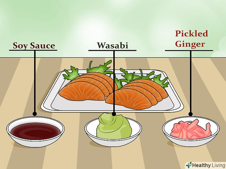 Знайте свої приправи.як правило, тарілка суші включає васабі( Зелена куля пасти), маринований імбир (тонкі рожеві скибочки) і дрібне блюдечко, щоб вмочати суші в соєвий соус. Налийте соєвий соус в цю маленьку тарілку, заповнивши її наполовину або менше.