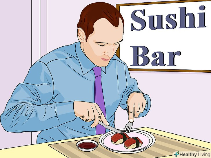Виберіть респектабельний суші-бар.це особливо важливо для того, хто вперше їсть суші. Погано приготована риба може зіпсувати відчуття, і ви ніколи не захочете знову їсти суші, особливо якщо ви взагалі не особливо любите морепродукти. Після того, як у вас вже було кілька позитивних дослідів вживання суші, ви можете далі експериментувати з суші-барами, але коли ви тільки починаєте, то не ризикуйте.- Попросіть поради. Якщо ви не впевнені щодо хорошого ресторану у вашому ціновому діапазоні, попросіть поради у друзів або інших місцевих жителів.