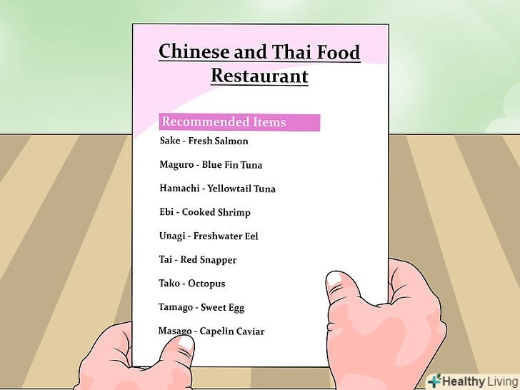 Прагніть до різноманітності. якщо суші-шеф занадто зайнятий або ви не можете сісти на барі, замовте різні види суші, щоб отримати уявлення про те, що Вам подобається. Замовте кілька шматочків нігірі, трохи маки, і спробуйте сашимі, якщо хочете ризикнути. Замовляйте те, що звучить для вас привабливо або те, що рекомендують. Якщо більша частина риби вказана без перекладу з японської (а так, ймовірно, і буде в хорошому ресторані), подивіться нижче переклад деяких поширених видів риб:- Шаке-свіжий лосось