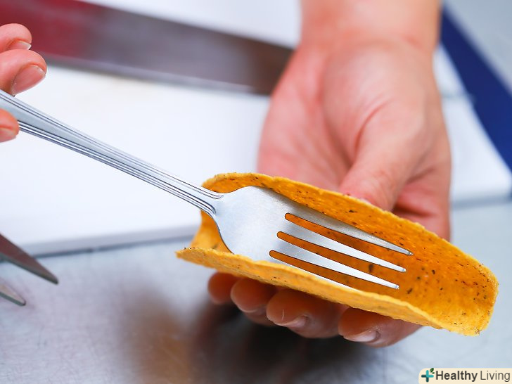 Допомагайте собі виделкою при поїданні тако з твердої коржі. ніколи не залишайте хрусткі тако довго лежати на тарілці, тому що начинка просочить тісто, корж розм'якне, соус витече на тарілку. Візьміть вилку, покладіть її праворуч зубцями вгору. Обережно вставте вилку в кінець тако, утримуючи його вертикально.- Вилка також виявиться корисною при наповненні коржі начинкою.