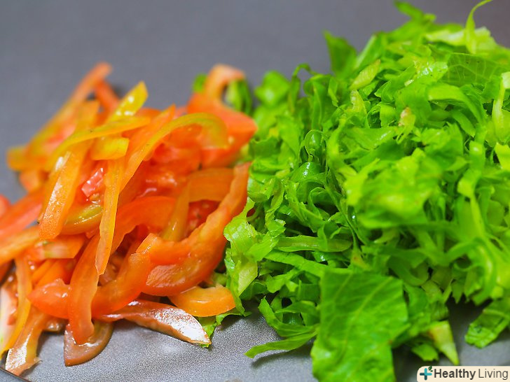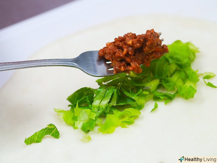 Покладіть на корж лист зеленого салату. це можна виконати як з твердої коржем, так і з м'якою. У будь-якому випадку, лист салату не дасть соусам витікати або просочуватися через коржик.- Майте також на увазі начинку, яку ви збираєтеся покласти на лист салату. Якщо ви покладете Гарячий фарш прямо на салат, він може зів'янути. На лист салату найкраще покласти сир, квасоля або рис.
