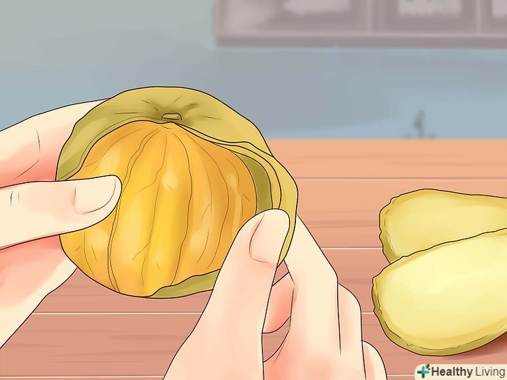 Виберіть фрукт, який здається важким для свого розміру. ви не можете сказати наскільки стиглий фрукт вугілля тільки за його кольором. Замість цього, шукайте фрукт, який здається важким для свого розміру і злегка піддається при натисканні пальцем на квітучий кінець.- Більшість погодиться, що фрукт виглядає потворно зовні. Шкірка жовто-зеленого кольору з попадаються прожилками оранжевого, і найбільш товста з боку корінця. Він трохи схожий на благородний мандарин, але у більше пори і більш шишкуватий або горбкуватий вигляд.