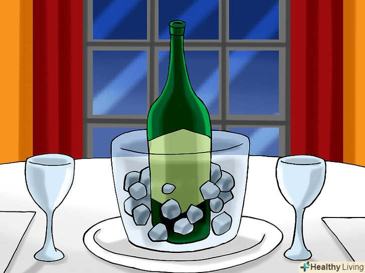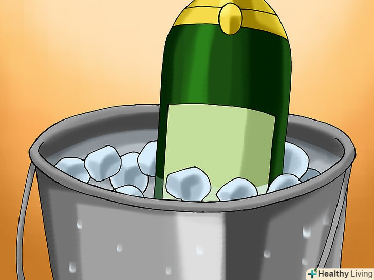 Охолодіть шампанське перед подачею. охолоджене шампанське смачніше, до того ж воно буде менше пінитися, коли ви відкриєте пляшку. Ідеальна температура шампанського для подачі-7-9 °C. Якщо у вас є час, то приберіть шампанське в холодильник за 4 години до подачі або раніше, щоб воно встигло як слід охолодитися. [6]- Класичний спосіб охолодження шампанського — це охолодження в відерці з льодом. Відерця для охолодження шампанського зазвичай більше тих, що використовуються для охолодження вина, щоб в них містилося більше води і льоду. Відро слід наповнити наполовину льодом і наполовину водою і залишити пляшку шампанського охолоджуватися в ньому приблизно 15-20 хвилин, а вже потім подавати його. [7]