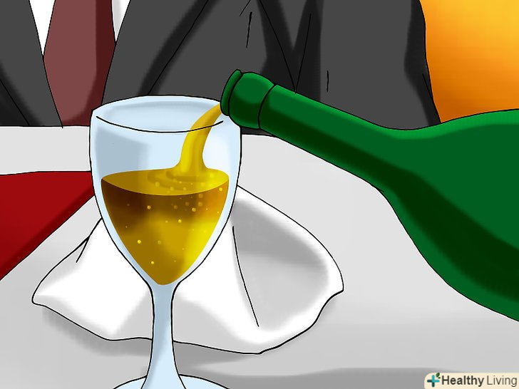 Знайте, як правильно наливати шампанське. це дуже важливий аспект, так як неправильно розлите шампанське втрачає свій відмітний смак і бульбашки. Щоб правильно налити шампанське, пляшку слід міцно тримати однією рукою біля основи, великий палець при цьому повинен знаходитися в поглибленні, а інші пальці повинні бути розведені. [11]- Налийте шампанське в келих по стороні, не наливайте безпосередньо на дно. Завдяки цьому в шампанському збережеться більше бульбашок. [12]