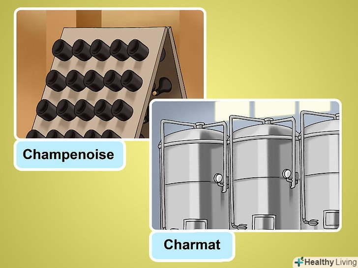 Виберіть вид шампанського на основі методу виробництва. шампанське проводиться з використанням різних методів: метод «шампенуаз» (фр. champenoise - «Шампанський метод»), метод шарму і метод закриття — кожен з них відрізняється часом бродіння. [2]- Найменш витратний під силу і часу процес — це додавання вуглекислого газу в вино (іноді таке вино називається іскристим або газованим).