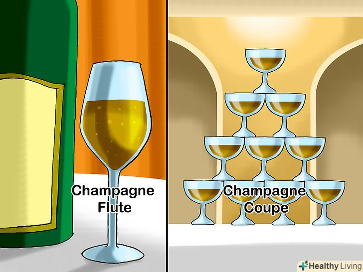 Вирішіть, в чому ви будете подавати шампанське. традиційно шампанське подають у високих вузьких келихах (келихи-флюті, або «флейти»), які найкраще зберігають бульбашки газу. Келих для вина з опуклою нижньою частиною дозволяє краще розкрити аромат і смак вина без значної втрати газу. [8]- Келих-креманка (іноді «кубок» або «блюдце») для шампанського має широке горлечко. Такі келихи часто використовуються в пірамідах (гірках) з шампанського на весіллях та інших урочистостях. Вони не зовсім підходять для сухих вин, які так популярні сьогодні, і шампанське в них швидко втрачає бульбашки і аромат.