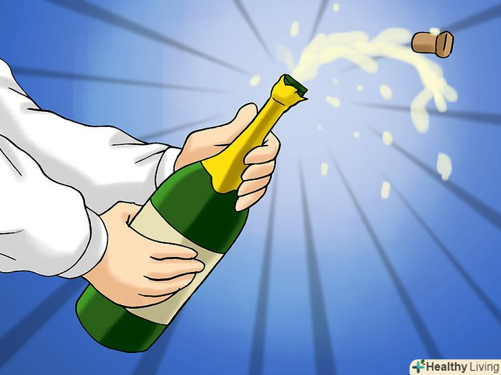 Витягніть пробку. щоб витягти пробку з пляшки шампанського тихо і безпечно, вам для початку слід послабити мюзле (вуздечка з дроту над пробкою), але не прибирати його повністю. Потім пляшку шампанського слід взяти під кутом 45° і почати обертати підставу пляшки. Робити це потрібно до тих пір, поки пробка не ослабне і не вискочить. [9]