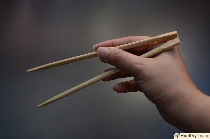 Покладіть першу паличку для їжі між основою вашого великого пальця і верхівкою вашого безіменного пальця вузьким кінцем, що вказує від вас. вона повинна лежати там зручно. Потім візьміть другу паличку для їжі між верхівкою вашого великого пальця і вказівним пальцем.