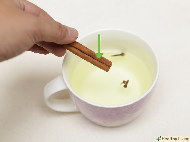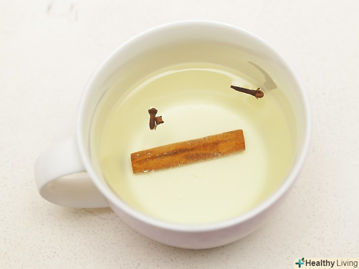 Залийте в кухоль окріп. як тільки вода закипить, зніміть її з вогню і залийте в кухоль з медом і коньяком. Після цього покладіть в кухоль скибочки лимона, одну паличку кориці і три бутона сухої гвоздики. Кориця допоможе полегшити біль в горлі. Крім того, вона багата антиоксидантами, а її аромат допомагає прочистити закладені пазухи носа. [5]- Гвоздика також допомагає зменшити біль і має антибактеріальні властивості.
