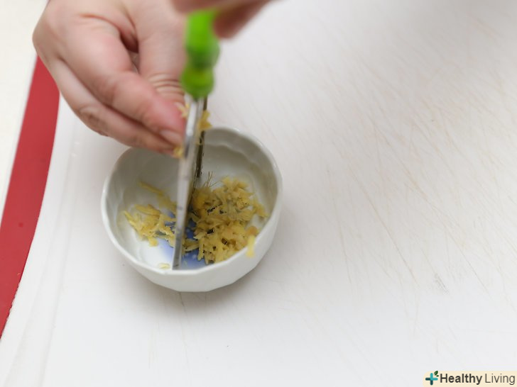 Потріть імбир. візьміть ніж і розріжте корінь імбиру на зручні шматочки. Поскребіть їх лезом ножа, щоб видалити шкірку, а потім натріть на тертці або потріть про зуби вилки — в результаті у вас вийдуть дрібні шматочки імбиру. [4]