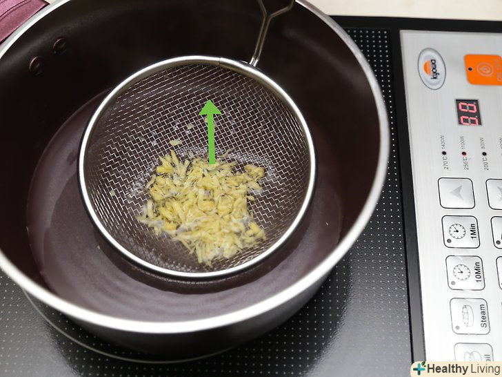 Процідіть гарячу воду з шматочками імбиру. після того як імбир завариться протягом 15 хвилин, його слід видалити. Розташуйте сито над великою мискою або глечиком і обережно процідіть через нього гарячу воду.- В результаті вода виллється в миску або глечик, а шматочки імбиру залишаться на решітці сита.