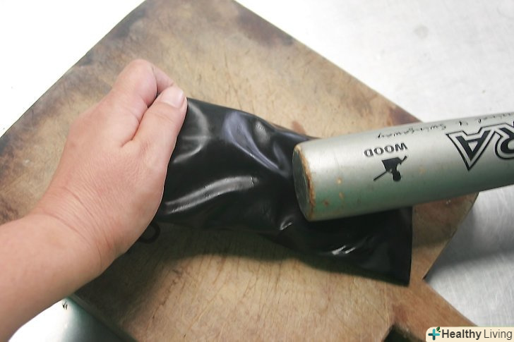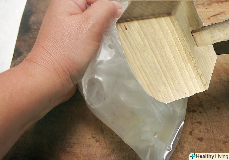 Візьміть великий хороший дерев'яний молоток, щоб роздрібнити лід. будьте обережні, не порвіть пакет. Якщо у вас немає молотка, візьміть будь — який інший тупий кухонний інструмент-товкач, наприклад.- Постарайтеся працювати повільно. Покладіть закритий пакет на дерев'яну дошку і методично роздрібніть весь лід. Не втрачайте голову, від алкоголю це трапляється.