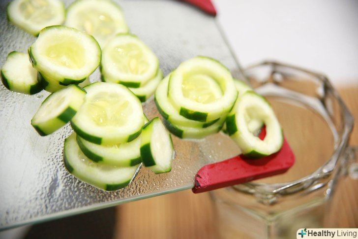 Покладіть шматочки огірка в глечик.шматочки огірка спливуть, тому якщо ви хочете зробити настій більш насиченим, покладіть поверх огірків кубики льоду - тоді огіркові скибочки будуть під водою.- Для найкращого результату, дайте напою настоятися хоча б протягом години.