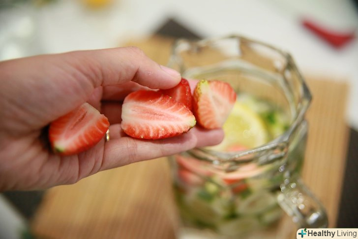 Додайте нарізану полуницю.приберіть у полуниці плодоніжки (зелені листочки) і ретельно помийте ягоди. Тонко наріжте полуницю уздовж і покладіть настоюватися в огіркову воду.- Полуниця є важливим джерелом калію, який допомагає знизити кров'яний тиск.[5]
