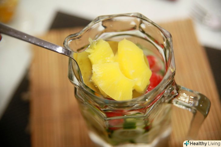 Додайте заморожені шматочки ананаса.шматочки ананаса додадуть огіркової воді кислинку. Наріжте свіжий або консервований ананас на шматочки і покладіть в морозильну камеру, щоб вони завжди були під рукою.- Додайте ½ склянки заморожених шматочків ананаса на глечик води