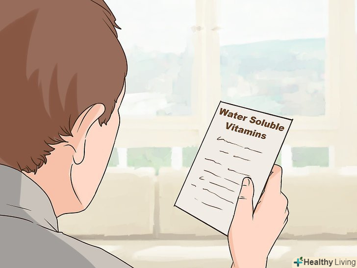 Дізнайтеся більше про водорозчинні вітаміни.існує два типи вітамінів: водо - і жиророзчинні.[16] водорозчинні вітаміни надходять в кров через воду, в той час як жиророзчинні розчиняються за допомогою поживних жирів.[17] навчившись відрізняти водорозчинні вітаміни, Ви зможете додавати в воду правильні продукти і отримувати від них максимум користі.- Майте на увазі, що фрукти, овочі, картопля, зернові та молочні продукти містять безліч водорозчинних вітамінів.[18]