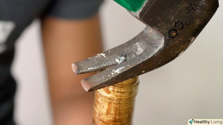 Вверніть в пробку шуруп і витягніть її молотком.закрутіть в центр пробки шуруп так, щоб його капелюшок виступала з пробки приблизно на 1,5 сантиметра. Візьміть шуруп задньою частиною молотка з роздвоєним хвостом і покачайте його взад і вперед, щоб послабити пробку. Після цього спробуйте нахилити пляшку, щоб з неї вискочила пробка.[10]Порада: шуруп можна вкрутити в пробку за допомогою дрилі, проте будьте обережні, щоб не пошкодити стінки пляшки.