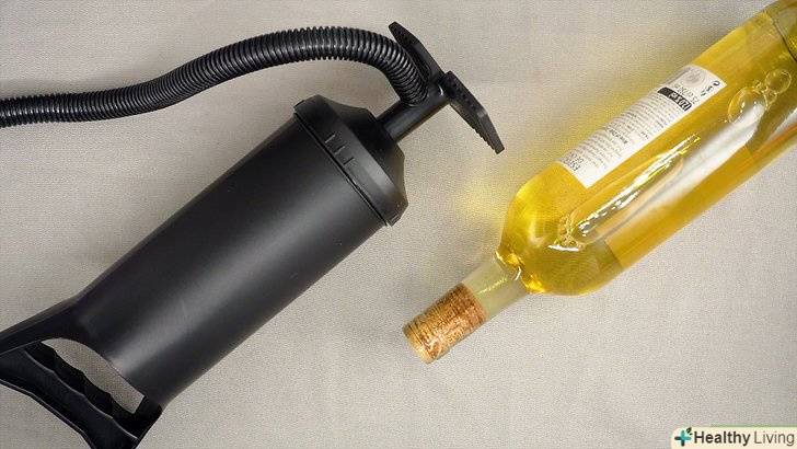 Дістаньте пробку з пляшки за допомогою велосипедного насоса.переконайтеся, що на кінці насоса є невеликий голковий наконечник. Проткніть голкою пробку, так щоб вона вийшла через її дно. Повільно закачайте повітря-при цьому пробка повинна піднятися з горлечка пляшки. Коли ви зможете захопити пробку рукою, витягніть її з пляшки.[12]- Якщо після декількох качків насоса пробка не підніметься, вийміть з неї голку. Якщо тиск буде занадто високим, пляшка може розбитися.