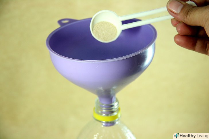 Додайте дріжджі через воронку в пляшку.струсіть пляшку, щоб перемішати цукор з дріжджами.