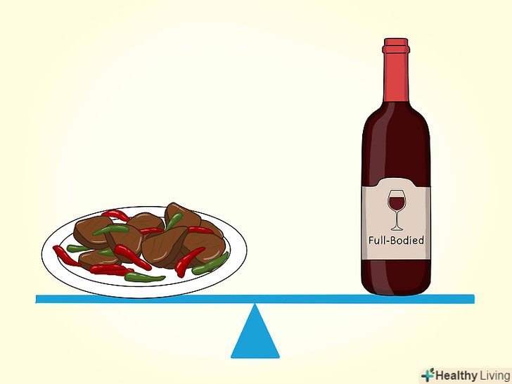 Врахуйте насиченість смаку і ситність їжі і поєднуйте їжу з відповідним вином. Правило "червоне вино до м'яса, біле вино до риби" занадто спрощує принцип вибору поєднань. Важливіше те, як вино і їжа доповнюють один одного. "Важка" їжа зазвичай ситна і має насичений смак (наприклад, м'ясний соус, гостре блюдо, ситний суп або рагу), тому вона вимагає насиченого вина, щоб «прорватися» через щільний смак. Їжа і вино не повинні перебивати один одного — у них повинна бути схожа насиченість.- Вина, які характеризуються як повнотілі, насичені, складні, багаті або багатошарові, найкраще поєднуються з ситними стравами. Навіть щільні білі вина можуть бути багатими і складними, завдяки чому вони відмінно поєднуються з гострими і ситними стравами.