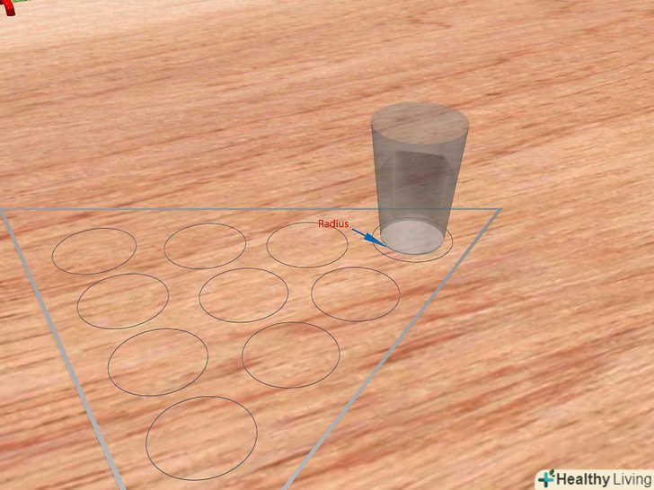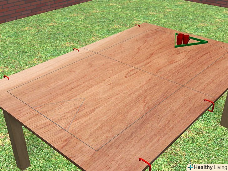 Відзначте верхівку трикутника поставивши стакан з отвором верхнім врехним трикутником в склянці і змалювавши його місце олівцем на фанері. зробіть те ж саме з іншими склянками в трикутнику. Відміряйте лінійкою відстань від основи столу до верхньої мітки.