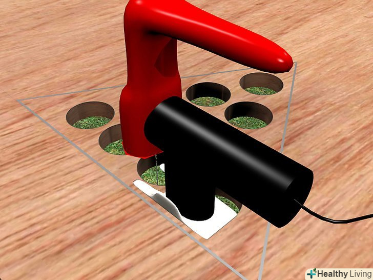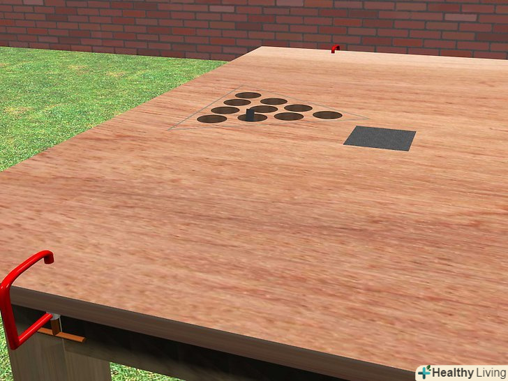 Виміряйте радіус дна одноразових пластикових склянок, які ви збираєтеся використовувати. встановіть в дриль відрізну чашку, яка трохи більше діаметром ніж виміряний радіус. Зніміть затискачі з фанери і переставте її так, щоб мітки знаходилися не над столом (радимо, щоб хтось допоміг тримати фанеру).- Просвердлите отвір праворуч від трикутника для склянки з водою. Точне місце значення не має, просто воно повинно бути досить далеко, щоб не переплутати зі склянками, які в грі.