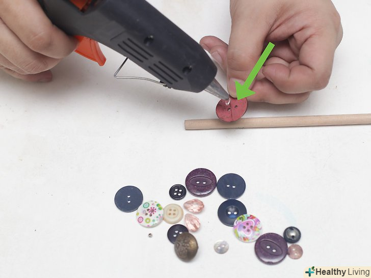 Можна приклеїти намистину або гудзик на підставу рукояті вашої палички.у деяких паличок на кінці рукояті є опукла частина. Можна зробити таку ж, приклеївши на підставу палички гарячим клеєм опуклу намистину або гудзик. Підберіть щось приблизно тієї ж ширини, що і підстава вашої палички, щоб воно не було надто вже великим.[5]- Не хвилюйтеся, що колір не підходить, пізніше ви зможете розфарбувати свою паличку.