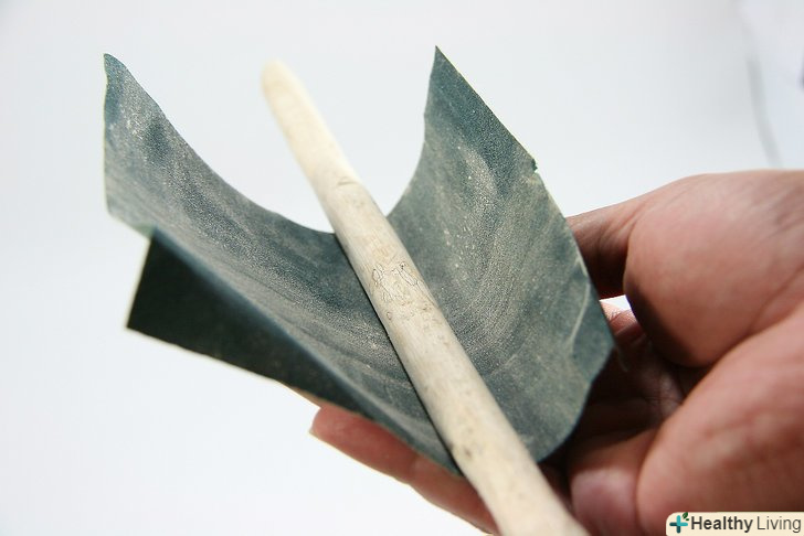 Ошкурьте один кінець палички так, щоб він став округлим. Це буде кінчик палички.[3] можна навіть надати паличці конусоподібну форму, щоб вона трохи звужувалася до кінчика як у фільмах. Почніть працювати з грубозернистою наждачкою, а завершіть полірувати паличку листом наждачки з дрібним зерном.- Якщо ви працюєте з гілкою, краще приберіть наждачним папером всі гострі і зазубрені нарости. Можна залишити кору і вузлуваті нарости на гілці, але при бажанні їх можна зрізати або зашліфувати.