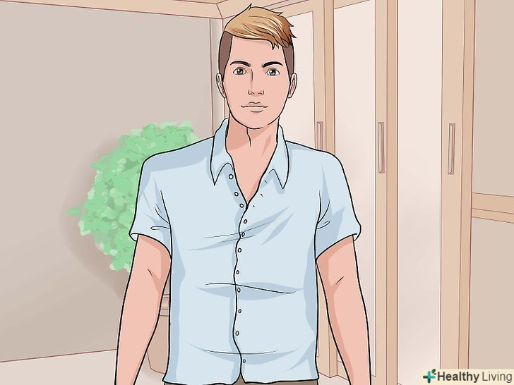 Одягніть сорочку на ґудзиках.одягніть сорочку звичайним чином, але не застібайте її до самого верху. Залиште верхні дві або три гудзики розстебнутими.