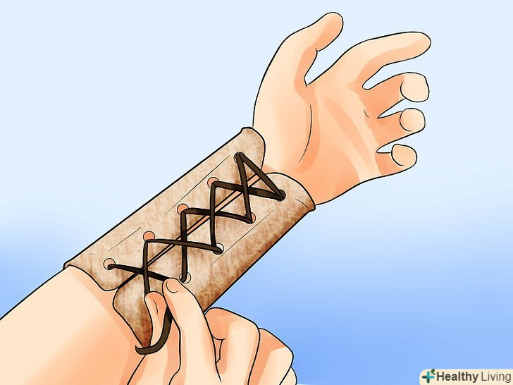 Всуньте шнурівку.як і у випадку з черевиками, аналогічним чином приступите до шнурування наручей шкіряним шнуром. Починайте роботу від зап'ястя і рухайтеся до ліктя.- Якщо кінчик використовуваного вами шнура почне распушаться, оберніть його шматочком малярного скотча. Так вам буде простіше зашнурувати наручі.