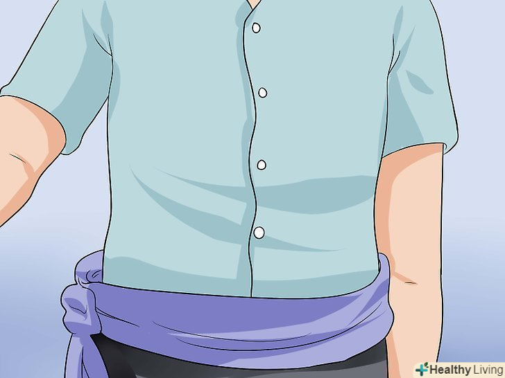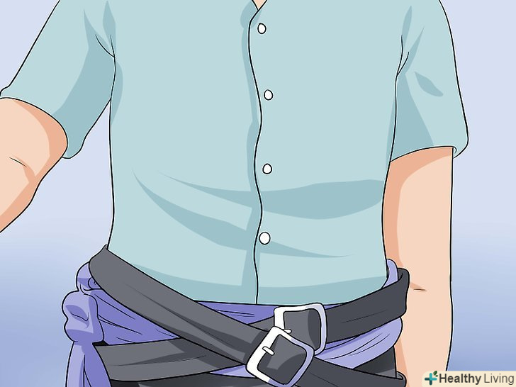 Підв'яжіть талію поясом-поясом.незважаючи на те що цей крок необов'язковий, наявність пояса доповнить зовнішню естетику костюма ассасина. Оберніть пояс навколо талії і підв'яжіть його так, щоб вільні кінці вільно звисали збоку.- Якщо у вас немає відповідного пояса (або схожого на пояс шарфа), замість нього можна використовувати футболку яскравого кольору. Так як у вас не буде можливості пов'язати футболку навколо талії, просто складіть її уздовж навпіл і підсуньте ділянку з рукавами під звичайний ремінь на талії, щоб основне полотно тканини звисало збоку.[3]