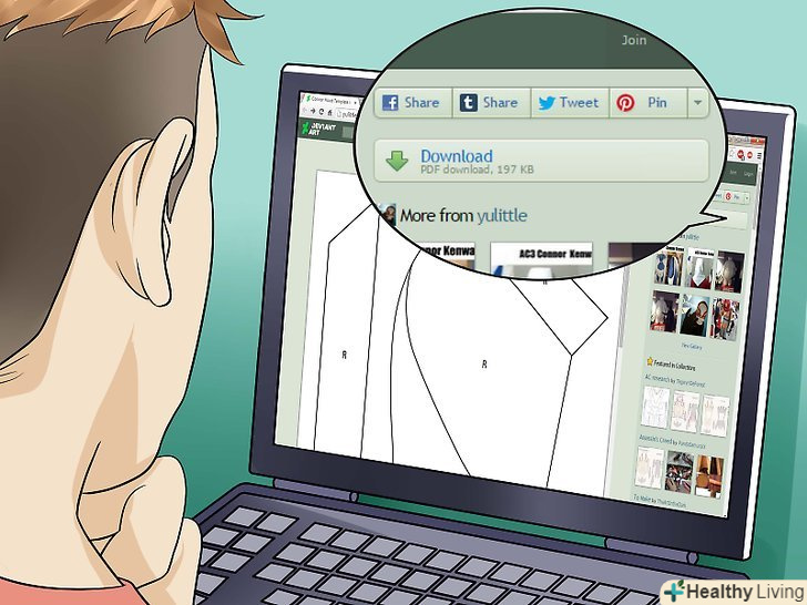 Скачайте викрійку капюшона ассасина з "Assassin's Creed".у мережі можна знайти багато безкоштовних викрійок даного аксесуара. Далі буде розглянуто капюшон ассасина Коннора, який при бажанні можна адаптувати під будь-якого іншого ассасина.- Скачайте викрійку за посиланням: " форма капюшона для костюма Коннора " від"Yulittle".[5]