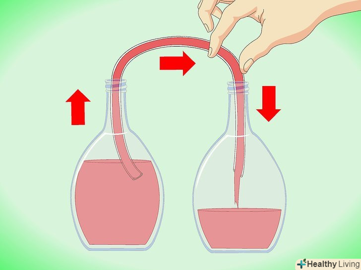 Процідіть мертві дріжджі.на дні пляшки залишиться шар мертвих дріжджів. Вони не отруйні, але мають жахливий смак. Поставте пляшку на піднесення, таке як стіл, і ще одну чотирилітрову бутель поруч на підлозі. За допомогою гумового шланга виготовте подобу сифона і переженете чисте вино без осаду в пляшку на підлозі. Постарайтеся не збовтувати вино занадто сильно. Приберіть шланг і вилийте все інше, коли на дні залишиться трохи вина і осад.- Також можна процідити вино через чисту тканину.