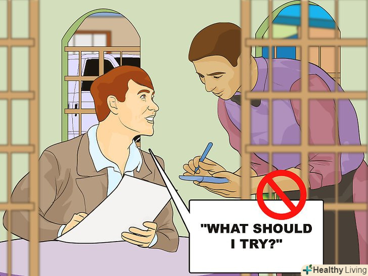 Завайте питання.[4] як тільки вам вдасться звернути на себе увагу знаючого офіціанта або сомельє ресторану, задайте йому всі питання, які вас бентежать.- При зверненні за рекомендацією важливо пояснити, що ви хочете. Просіть порадити вам щось схоже на те, що Вам подобається, або детально опишіть, яке вино ви зазвичай п'єте.