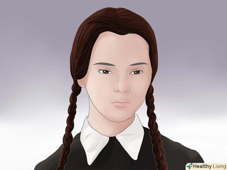 Якщо у вас світле волосся,Перефарбуйте в темний колір.Заплетіть волосся в дві тонкі кіски, якщо ваше волосся досить довгі. Зверніть увагу, що косички повинні висіти, а не стирчати. Ви ж не хочете виглядати як Пеппі Довгапанчоха.- Хоча з чорним волоссям ви будете більше схожі на Уенсдей, майте на увазі, що цей колір йде не всім. До того ж ви можете виглядати нерозумно, якщо на чорному волоссі буде видно світлі коріння.