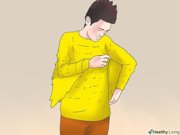 Одягніть тіло качки або каченяти.одягніть толстовку, будьте обережні, щоб не відірвати фетр або пір'я.- Якщо толстовка неприємна до тіла, то її можна надіти на сорочку. Нижня сорочка не повинна бути видна з-під толстовки. Якщо її все ж видно, то за кольором вона повинна відповідати кольору толстовки (бути білою для дорослої качки або жовтої для каченяти).