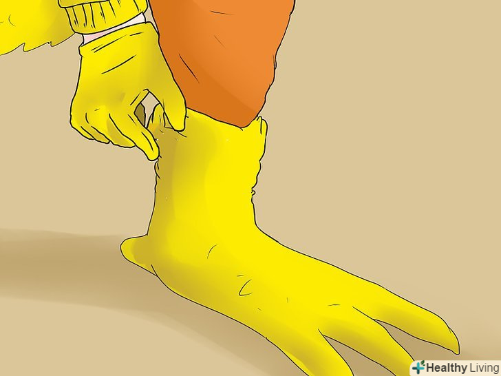 Одягніть черевики, а потім натягніть Качині шкарпетки. Надягніть черевики. Одягніть шкарпетки з липучками поверх черевиків і просуньте ноги в отвори на лапах. Зафіксуйте лапи, придавивши половинки застібок-липучок.