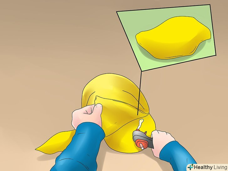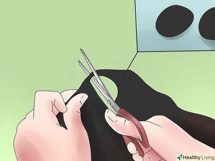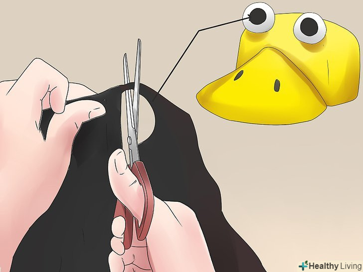 Виріжте і приліпите ще два кружечка з фетру, вони будуть зіницями.виріжте ще два гуртка діаметром 1,3 см з чорного фетру. Приклейте їх клейовим пістолетом спереду по центру помпонів.- Даний крок завершує виготовлення голови качки. Відкладіть бейсболку в сторону, поки будете працювати з іншою частиною костюма.